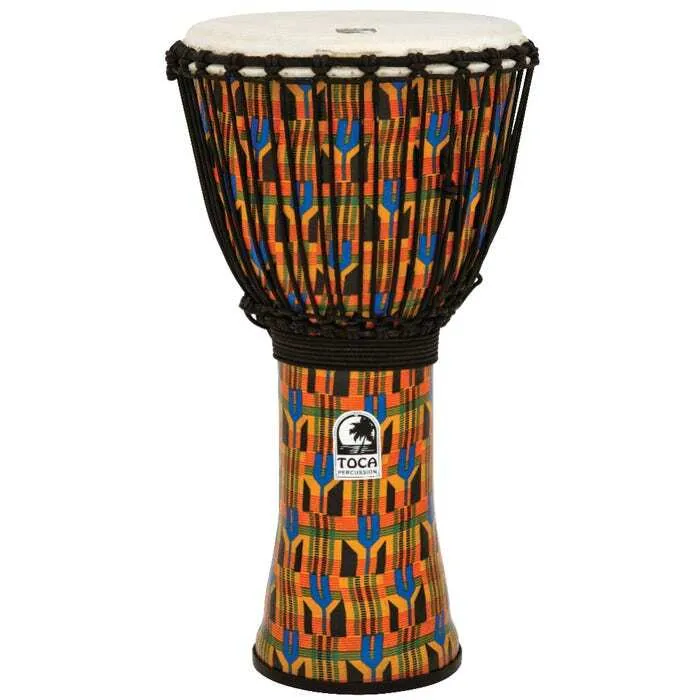 Toca Freestyle 12" tunable djembe is extremely lightweight and durable with a seamless fiberlass shell and protective rubber bottom. Natural goatskin head with nylong rope tuning produces great bass and high accent tones. Portable and lightweight design makes this djembe perfect for drum circles and drummer of any age.